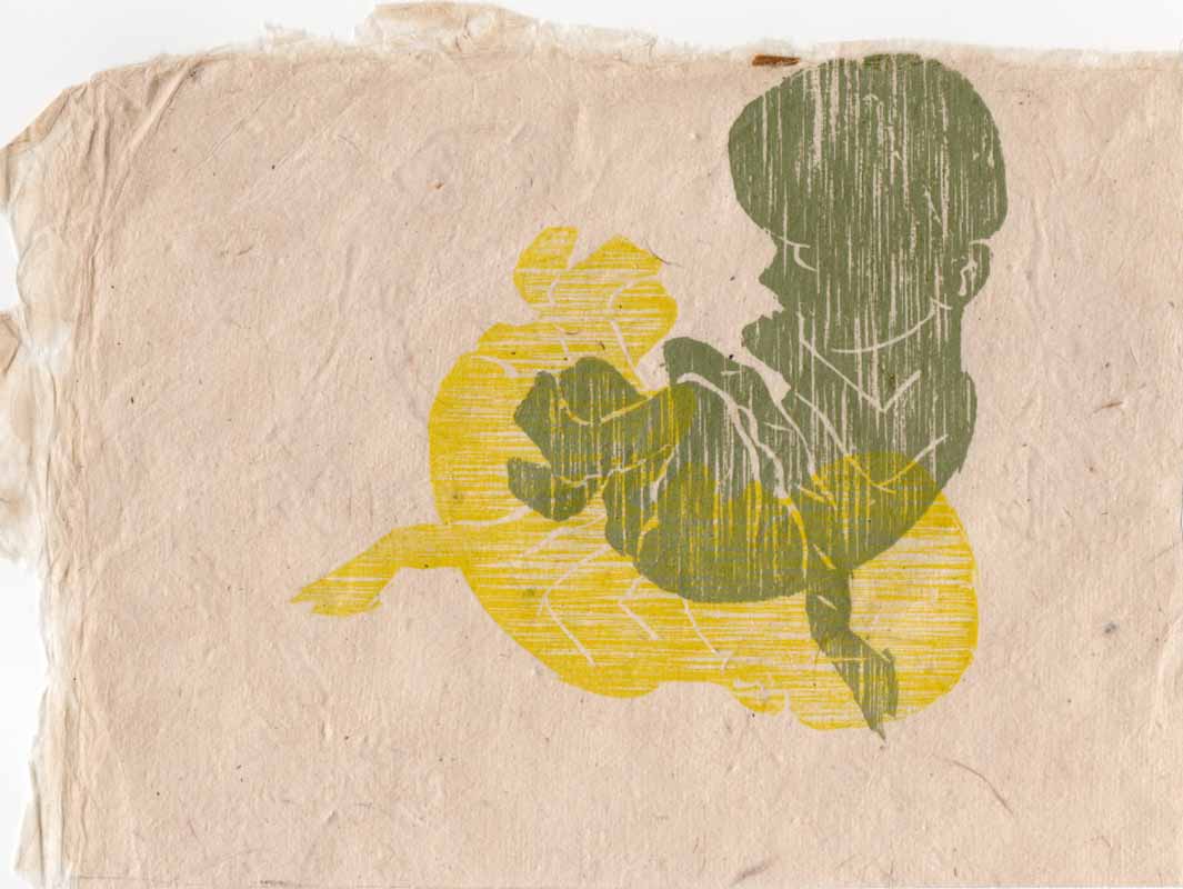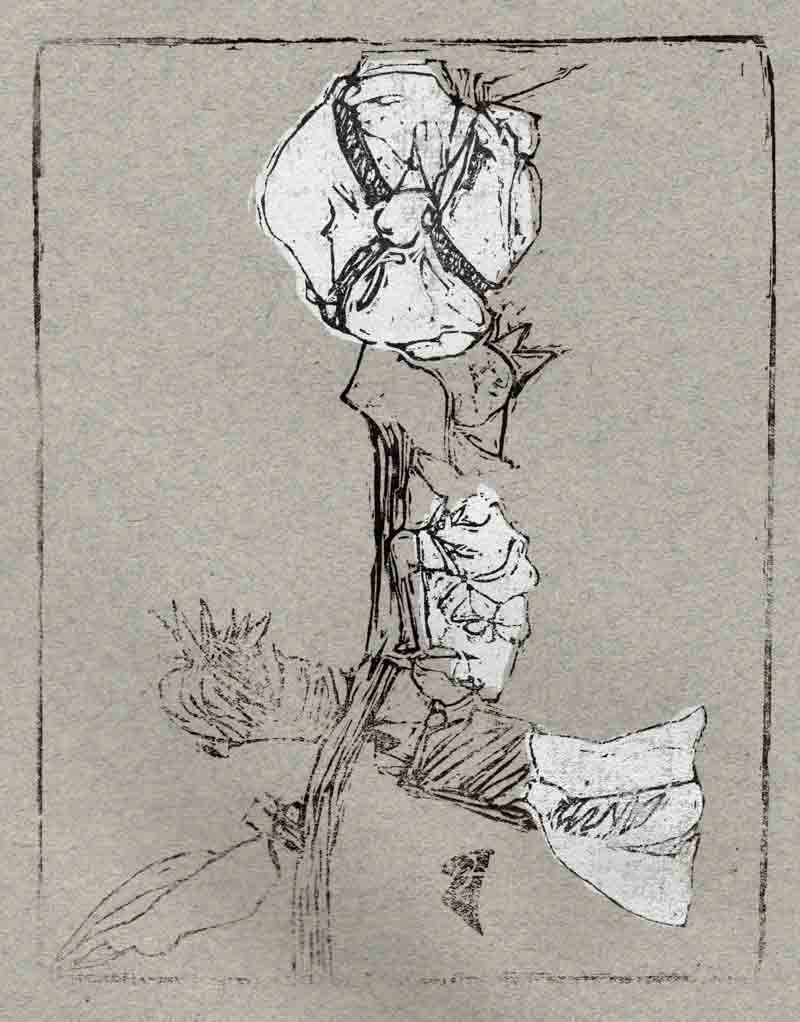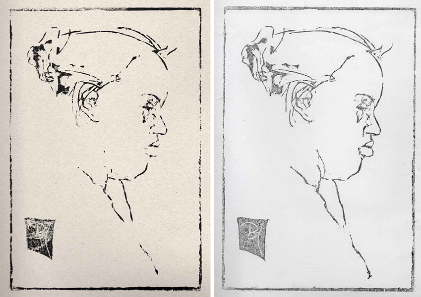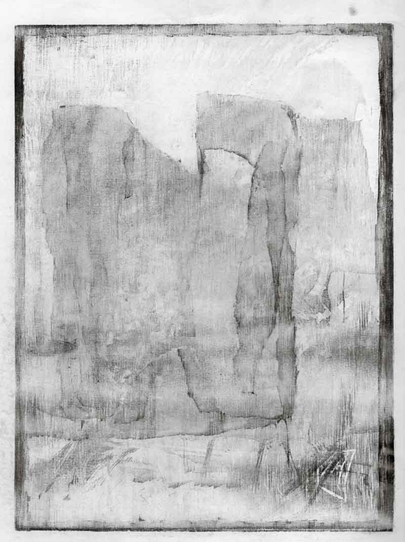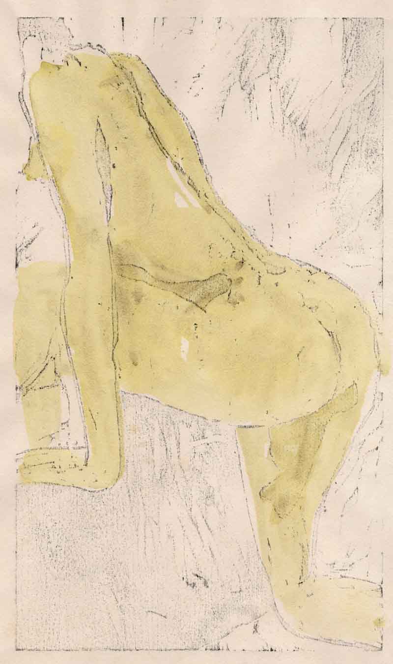 Voorhandig papier kan in zo’n geval ook papier zijn wat gewoon ergens rondslingert (ik ben een begenadigd chaoticus) en waar al iets op gedrukt is. En dan kan het drukken soms hele mooie toevallige resultaten of combinaties opleveren. Een embryo dat plotseling een tweelingbroertje of – zusje blijkt te hebben; een mistig beekdal dat opeens nog mistiger is geworden; of een model, dat op de achterkant van het papier opeens een heel sprekende tekening wordt, die alleen nog een kwastje aquarelverf nodig heeft om echt iets te worden. Wel weer jammer dat die laatsten op gewoon goedkoop krantenpapier zijn gedrukt. Niet echt voor de eeuwigheid, ben ik bang. Maar ach, wat is eeuwigheid; we leven nu. En nu zijn het best mooie plaatjes. Toch?