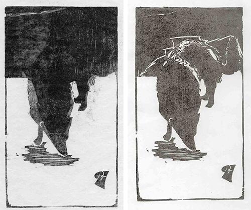 Aan iedere uiteindelijke druk van houtsneden gaan proefdrukken vooraf. En proefdrukken druk ik meestal op papier dat zomaar ergens voorhanden is. Het kan een stukje mooi Japans papier zijn, maar ook gewoon printerpapier, of iets willekeurig anders. Ik let dan maar op 1 ding: lijkt de druk op wat ik beoog met mijn houtsnede? En als het gaat om meerdere drukken over elkaar: past het geheel goed in elkaar en werken de kleuren/grijsvlakken zoals ik ze bedoeld heb?